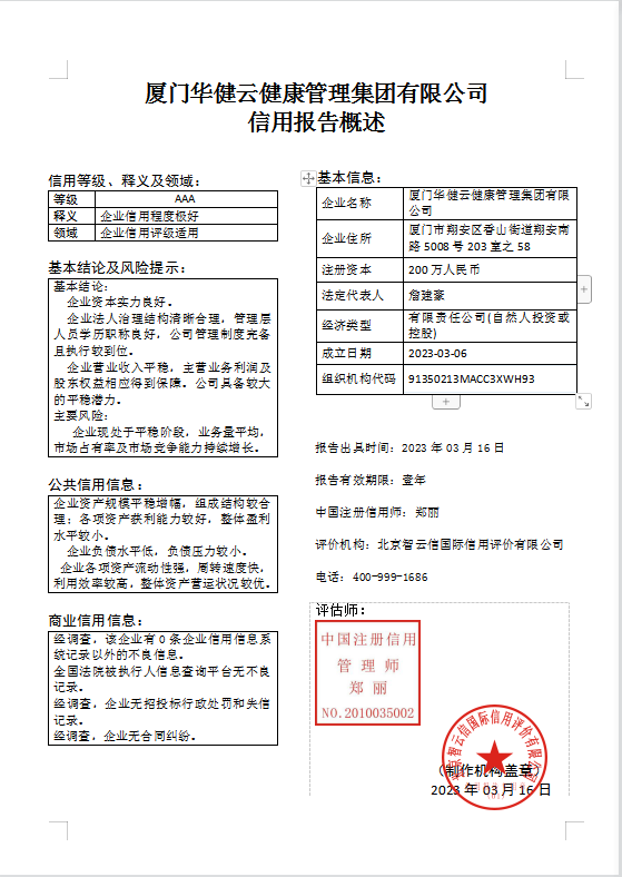 二、本信用證書和信用檔案是中立和中性的,它證明該單位已納入社會(huì)信用體系的監(jiān)督之中,任何組織和個(gè)人可以遵循誠信原則方便地對(duì)該單位進(jìn)行評(píng)價(jià)(表?xiàng)?、批評(píng)、建議);任何組織和個(gè)人可以方便地查詢?cè)搯挝涣己眯畔ⅰ⒉涣夹畔⒑驼男畔?。該單位也可以通過誠信經(jīng)營不斷增加信用分值和增加良好信用信息記錄,積累信用無形資產(chǎn)。三、根據(jù)該單位提供的相關(guān)資料,依據(jù)中華人民共和國信用行業(yè)標(biāo)準(zhǔn)Q/ZYX 002-2019《企業(yè)信用評(píng)價(jià)體系標(biāo)準(zhǔn)》,專業(yè)第三方信用評(píng)價(jià)機(jī)構(gòu)或信用認(rèn)證機(jī)構(gòu)對(duì)其信用等級(jí)評(píng)定為:AAA 級(jí)。四、提醒該信用檔案、信用證書及信用銘牌的使用者:請(qǐng)密切關(guān)注合作和交易對(duì)方的各項(xiàng)信用指標(biāo)或最新信用報(bào)告或年檢記錄信息,整體把握信用風(fēng)險(xiǎn),以保障合作和交易安全;請(qǐng)隨時(shí)關(guān)注合作和交易對(duì)方的信用動(dòng)態(tài)變化或跟蹤評(píng)價(jià)報(bào)告,及時(shí)把握信用趨勢(shì),以掌控商業(yè)風(fēng)險(xiǎn)。信用是企業(yè)的生命線;信用檔案是企業(yè)信用評(píng)價(jià)結(jié)果的動(dòng)態(tài)記錄,具有法律效力的信用證書是企業(yè)、商家及網(wǎng)站的第二“信用身份證”,信用檔案和信用證書是企業(yè)、商家及網(wǎng)站獲得客戶信任、促成合作和交易的基礎(chǔ),是大眾消費(fèi)、合作和交易決策的重要依據(jù),是我國社會(huì)信用體系建設(shè)的公平保障體系。